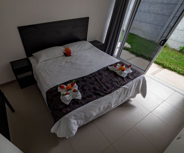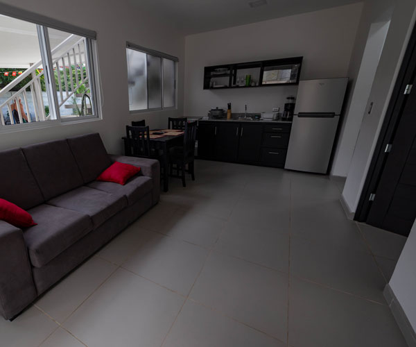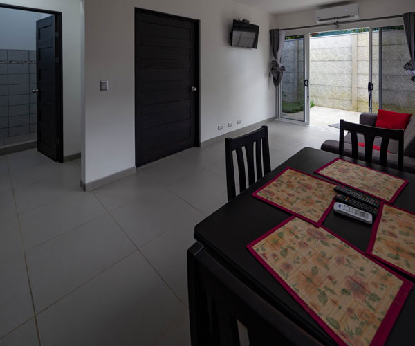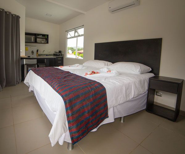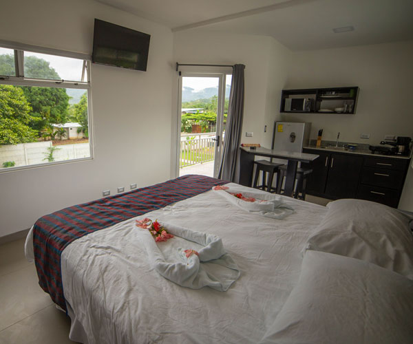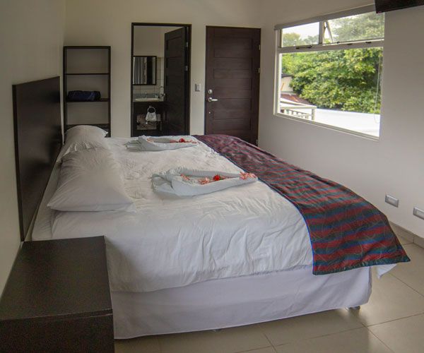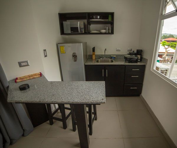 Villa Playa Ventanas has spacious and comfortable studio-like space for 2 people. It has a King bed, a well-lit bathroom and drapes to offer our guests more privacy. It has a flat screen, a King bed, a coffee maker, air conditioning, wireless internet and hot water in both the shower and the sink. They also have a breakfast bar, a fridge and a balcony with garden view.